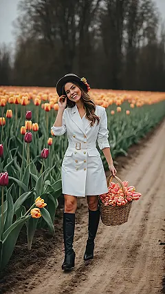 Strutting through the fields in this tulip farm outfit must be quite the adventure. You’ve got acres of stunning flowers stretching out, making the perfect backdrop for photos, but also… dirt. Lots of dirt. Hopefully, those stylish boots are more about making a statement than practical farm work, because dodging muddy puddles while keeping that white dress pristine sounds like a full-time job. But honestly, the whole scene just works, proving you don’t need overalls to enjoy nature’s beauty – sometimes a little unexpected glam is exactly what a field of flowers needs.