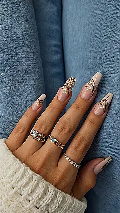 These nails are giving off major spring vibes, but also like you’re about to write a super important scroll! The nude base color is perfect for letting those brown swirls take center stage, almost like fancy latte art but for your fingertips. Just try not to accidentally swipe them through your actual latte, okay? Because that artwork looks too good to mess up.