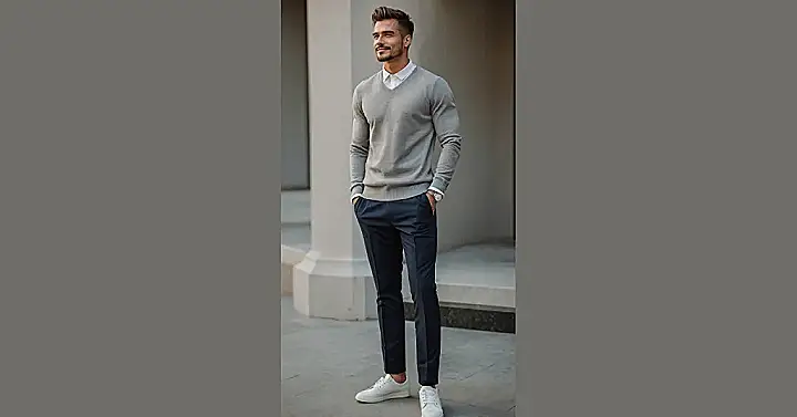 Check out this look: a cool blue sweater over a crisp white shirt? That’s like saying “I’m relaxed, but I also know how to iron.” Paired with those dark pants that aren’t jeans but aren’t stiff suit trousers either, it hits that perfect middle ground. And let’s talk about those white sneakers! They’re the secret weapon of smart casual – they make the whole thing feel laid-back instead of stuffy. It’s the kind of outfit that says, “Yeah, I cleaned up, but I’m still cool enough to hang.” Way better than wearing a full suit to grab pizza, unless that’s your vibe.