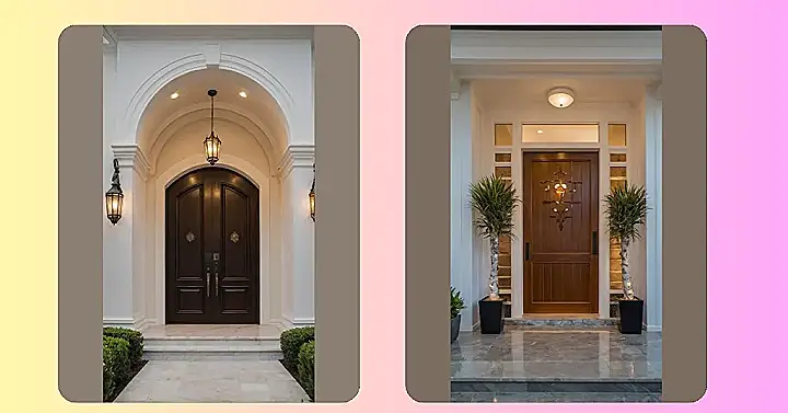 This main entry door is definitely trying to make a statement! With those serious-looking potted plants standing guard and the lights glowing like tiny welcoming spotlights, it feels less like walking into a house and more like arriving at a slightly intimidating VIP lounge. I’m pretty sure if you knocked, the door itself would give you a once-over before deciding if you’re cool enough to enter, especially with that fancy ironwork giving it a sort of medieval, ‘are you a knight or just here for cookies?’ vibe.