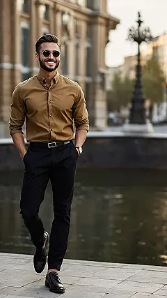 Hey there, fashion-forward friend! Check out this dude rocking the “men’s smart casual outfits” look. He’s basically saying, “I can be polished *and* comfortable.” It’s like the best of both worlds—the kind of outfit that’s perfect for a nice dinner with your grandparents, then hitting the arcade afterward. That brown jacket is a total vibe, and those beige pants? They’re seriously chic without looking like you just escaped from a business meeting. He’s even got his sunglasses on, ready to impress everyone.