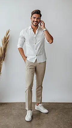 Heading to a summer wedding means sunshine, maybe an outdoor ceremony, and the real challenge: looking sharp without turning into a human puddle. Forget the heavy suits that feel like wearing a blanket in July. The trick is light and bright, just like the outfit in the picture! A crisp white shirt keeps things breezy, and those light-colored pants reflect the sun better than a vampire avoids daylight. It’s about looking cool literally and figuratively, so you can focus on the cake and trying not to step on the bride’s train instead of how sticky you feel.