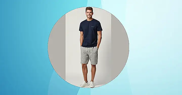 This guy is rocking a classic look that’s perfect for relaxing and hanging out with friends. A simple navy t-shirt and comfy grey shorts – talk about a winning combo! He’s got the “I’m not trying too hard, but I still look good” vibe going on. Maybe he’s heading to the park for a game of frisbee or just chilling on the couch with a good movie. Whatever he’s up to, this outfit makes him look super relaxed and ready to have a good time.