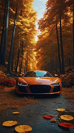 Look at this fancy orange sports car just chilling in the middle of an autumn forest that’s exploding with golden colors! It’s parked like it owns the place, probably taking a break from zooming down boring highways to find the most dramatic spot possible for a picture. Honestly, it looks like it rolled right into a painting just to pose. This isn’t just any photo; it’s totally screaming to be your next artistic wallpaper, making your screen look way cooler than it has any right to be.