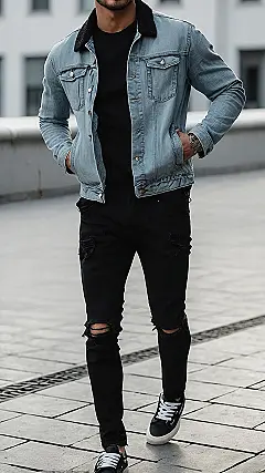Pulling on a pair of black ripped jeans like these with a cool jacket and sneakers is like instantly upgrading your look from “just okay” to “where’d he get that?” It’s the go-to uniform for looking sharp without looking like you’re trying too hard. This kind of simple, cool men’s streetwear outfit just feels easy and ready for whatever the day throws at you, whether it’s hitting the skate park or just hanging with friends.