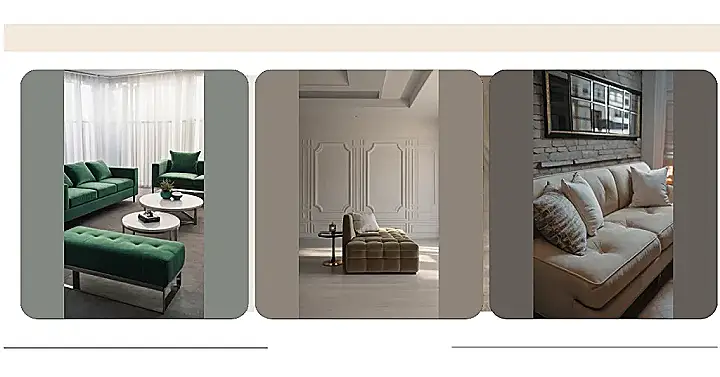 This sofa looks so fancy, it practically has its own bodyguard! It’s like the king of all couches, sitting there with a little side table and a candle that’s probably more expensive than my entire wardrobe. Imagine sinking into those plush cushions, while you scroll through your phone or read a book. You’d be surrounded by pure comfort and a touch of elegance that’s more “royal ball” than “school dance.”