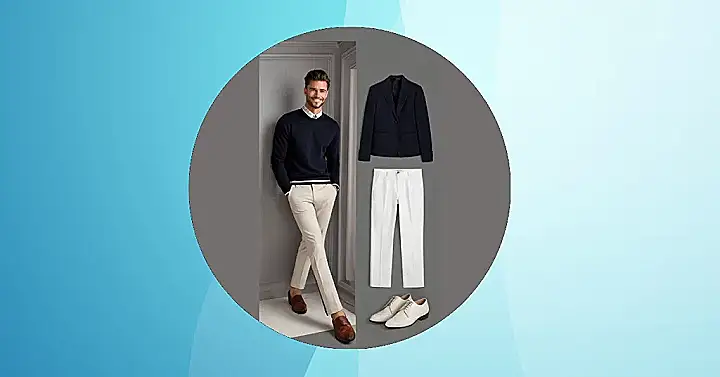 This guy’s got the whole classic men’s clothing style thing down. Think navy blazer, crisp white pants, and a comfy sweater. He’s all set to impress at a fancy dinner or maybe even a casual date night. The whole outfit screams “I know how to dress” without shouting “I’m trying too hard!”. It’s like he just threw this together, but it’s totally effortless and stylish. He’s got a secret weapon, though: those cool loafers! Those shoes are a real statement piece, adding a touch of “I’m way too cool for school” that brings the whole look together.