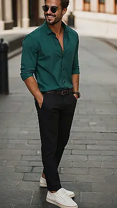 Want to ditch the boring t-shirt and shorts combo this summer? Take a page from this dude’s book! He’s rocking a look that says, “I’m cool, collected, and probably know where the best ice cream place is.” That green shirt is a total power move, and the black pants keep things classy without being stuffy. Plus, those white sneakers are the perfect finishing touch – comfy enough for a day of exploring, but stylish enough to impress.