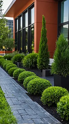 Look at these plants, all lined up like they’re waiting for a school photo! Those round bushes are so perfectly shaped, you’d think they get their haircuts with a laser pointer. And the tall skinny ones are standing extra straight, probably trying to look taller than the building. It’s pretty funny how adding just some green stuff can make a plain city sidewalk and a building look so much more welcoming and, dare I say, stylish. It’s like the building finally got dressed up for a fancy party!