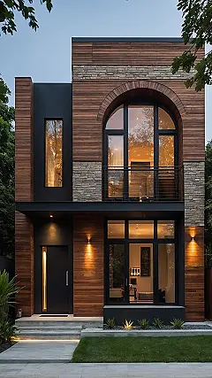 This house looks like something straight out of a movie, or maybe just my wildly ambitious ‘dream house plans’ binder that currently contains only crayon drawings. It’s got those cool balconies that probably face a forest or maybe just your neighbor’s slightly less epic backyard. I bet the windows are so big you could wave at birds… or awkwardly at strangers. Definitely the kind of place where you’d need a map just to find the kitchen for a midnight snack.
