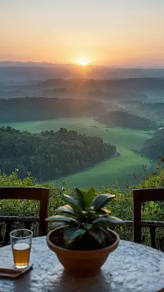 Imagine waking up to this view! It’s like a scene straight out of a movie, with rolling hills, a golden sunrise, and enough peace and quiet to make you forget all your worries. It looks like the perfect spot to enjoy a cup of something warm, maybe some hot chocolate or tea, while the world wakes up around you. Seriously, who needs a fancy resort when you have this kind of beauty right in your backyard?