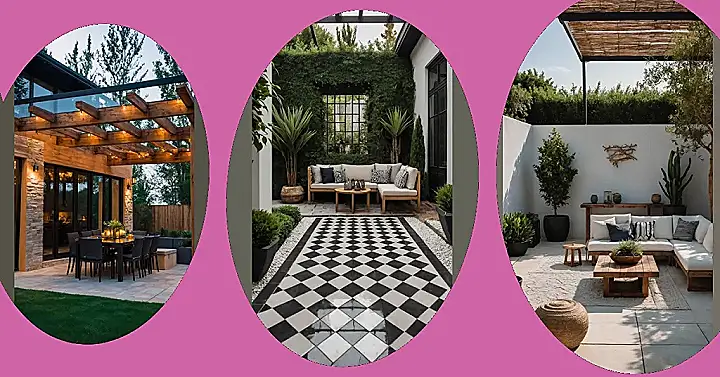 Plus, check out that epic floor! It’s like they laid down a giant chessboard, perfect for practicing your knight moves or just making your backyard look super fancy. Mixing patterns like this black and white tile with all the green plants is what makes outdoor decor interesting – it’s not just about stuffing some flowers in a pot. It shows that even the ground you walk on can be part of the fun, making your outdoor space feel less like a yard and more like your own personal palace… just make sure you don’t actually try to play chess on it with full-sized pieces.