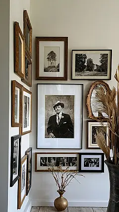 This wall isn’t just a collection of pictures; it’s a time machine! Imagine stepping back in time with all these vintage frames and awesome black-and-white photos. There’s a dapper dude in a hat, some stunning landscapes that look like they’re straight out of a classic movie, and even a mirror that’s probably seen a few decades of stylish hairstyles. It’s like a gallery of memories, all ready to tell stories— if only those old photos could talk!