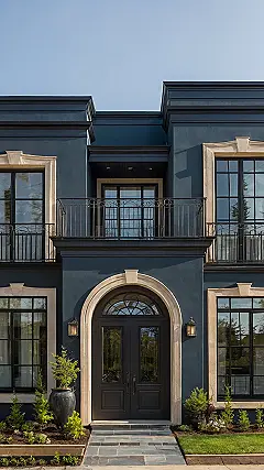 Looking at this picture, you can see how getting the ‘front elevation designs’ right really works. That deep blue color combined with the lighter trim around the windows gives it a super cool, stylish vibe. See that impressive arched doorway and the cute little balcony upstairs? They aren’t just random additions; they’re specific design choices made to give the house personality and make it stand out from the sidewalk. It’s like giving your home its own unique outfit to make the best first impression possible!