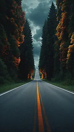 Check out this road, winding up into the clouds like it’s heading straight to that secret level you can never find! Those trees on the sides are flexing hard, showing off their awesome fall colors mixed with deep green, basically giving your screen a major glow-up. Picking this as your artistic wallpaper is like giving your phone or laptop a little vacation, a tiny adventure every time you unlock it. It’s way cooler than looking at your messy desktop folders, right? Plus, those dramatic clouds make it look like something epic is about to happen, maybe like your next assignment is finally going to write itself.