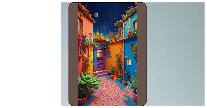 Wow, this picture is like stepping into a super-fun, slightly-crazy dream! The buildings are so ridiculously bright, like they decided being boring was just not an option today. Plus, those plants are practically overflowing with colour, and check out that starry sky and moon! It’s like a party is happening up there too. If you’re looking for artistic wallpaper that screams personality and maybe even moonbeams, this scene is totally ready to jump onto your screen and make everything way more awesome.