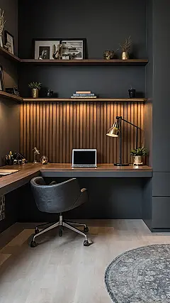 Wow, check out this home office setup! It looks so sleek and organized, it almost tricks you into thinking you could actually focus here. With those fancy backlit shelves holding important-looking books (and probably some random cool trinkets), it feels less like a workspace and more like a secret hideout where you’re plotting world domination or, you know, just trying to finish that history essay. It definitely beats trying to balance your laptop on a pile of textbooks in your living room.