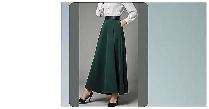 That green skirt is totally rocking the “fall vibes” with its long, flowy shape. It’s like a comfy, cozy blanket you can wear, but way more stylish. You can imagine strolling through the park with all the colorful leaves swirling around your feet.
