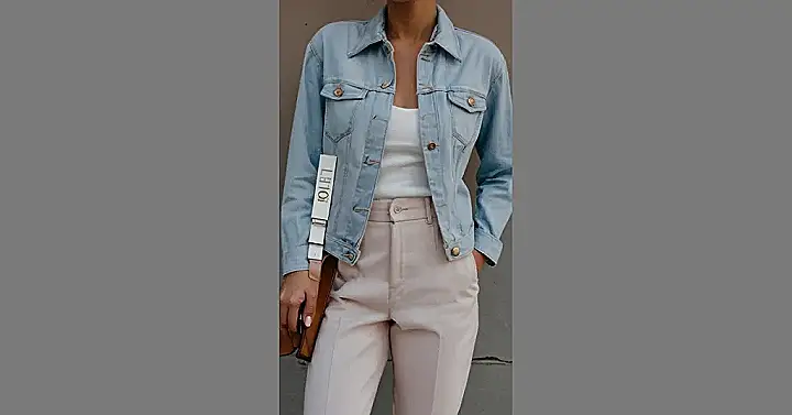 This picture shows a girl rocking a classic denim jacket. It’s like the perfect “I’m cool, but I don’t even care” look. The denim jacket adds a touch of effortless style to her outfit, which is also super comfy with the white t-shirt and creamy pants. You could wear this outfit to hang out with friends, go to the mall, or even just chill at home. It’s super versatile, just like a denim jacket!