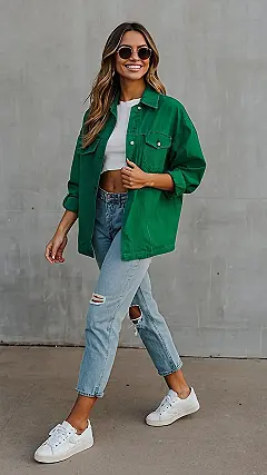 This girl is rocking a look that’s totally on point! Her ripped jeans are the perfect amount of cool, and her green denim jacket is adding a pop of color that’s totally unexpected. It’s like she’s saying, “I’m not afraid to be different, and I’m definitely not afraid to look amazing while doing it!” She’s got that effortless style that makes you want to copy everything she’s wearing. And the best part? Those ripped jeans look like they’re super comfy, so she can rock this look all day long.