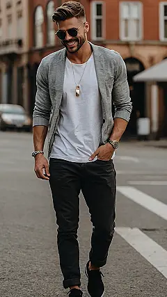 Want to look like you just stepped out of a magazine, but without trying too hard? This look is perfect for that! It’s like saying, “Hey, I’m stylish, but also super chill and ready to grab some pizza.” Ditch the sweatpants (sometimes!), and try some cool chinos or jeans, a comfy tee or sweater, and a jacket that screams “I’m awesome,” all while keeping it super comfy.