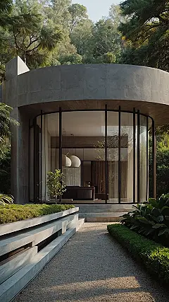 This house looks like it belongs in a movie! It’s sleek and modern, with big windows that let in tons of light and show off the gorgeous view of the trees. You could almost imagine a cool superhero living here, right? The whole place is built with concrete, which gives it a super strong and durable vibe. It’s almost like a giant, modern fortress built for a secret agent!