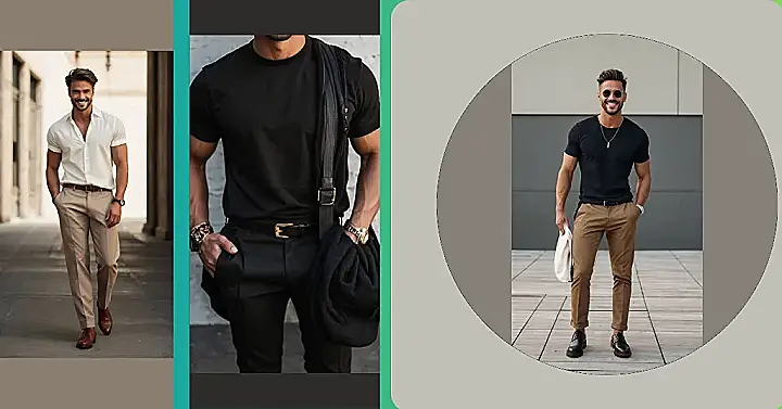 This guy knows how to rock a basic outfit and make it look totally awesome! He’s got a black t-shirt, some khaki pants, and a pair of black shoes – simple, right? But the way he’s got everything put together makes him look like he’s totally in control, like he’s got everything figured out. He’s got a cool vibe going on, and he’s not afraid to show it off. You know, the kind of guy who’d walk into a room and everyone would just look at him and think, “Wow, he looks good!”