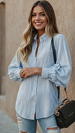 Pairing that breezy shirt with some ripped jeans? Genius level unlocked. It’s like saying, “I’m fancy-ish on top, but still ready to chill.” Add a cool bag and that smile, and you’ve got the ultimate easy-going, stylish look that makes you feel put-together without trying too hard. Who knew a simple shirt outfit for women could look this good and feel this easy? It’s pretty much the perfect recipe for looking awesome without any drama.