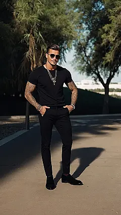 Want to look like you just stepped out of a music video, but also like you could debate philosophy? This dude’s got you covered. He’s rocking the all-black look, which is basically the ninja of fashion – sleek, mysterious, and always in style. Check out those shades, too – they’re not just blocking the sun; they’re blocking out the haters.
