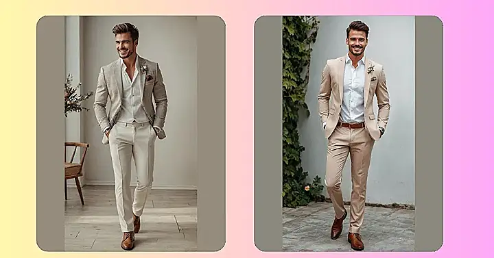 So, summer wedding invites just landed, and you’re picturing yourself sweating through your winter suit like you just ran a marathon in a sauna. But hold up! Check out this guy looking like a million bucks in that awesome light-colored suit. He knows the secret: pick a suit color that doesn’t attract the sun like a magnet. Standing around outside waiting for the ceremony shouldn’t feel like you’re actually inside the wedding cake oven; a cool suit like this beige one is your best friend, making you look sharp without melting into a puddle before the first dance.