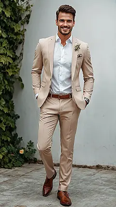 Summer weddings are basically the universe’s way of testing how well you can look sharp while trying not to sweat through your clothes like you just ran a marathon. Forget roasting in a dark suit that feels like a portable sauna; checking out the picture here shows the way to go. A lighter color, like this cool peachy-beige number, is your secret weapon against the heat. It makes you look breezy and put-together, so you can actually focus on celebrating the happy couple instead of wondering if your tie is about to get soggy.