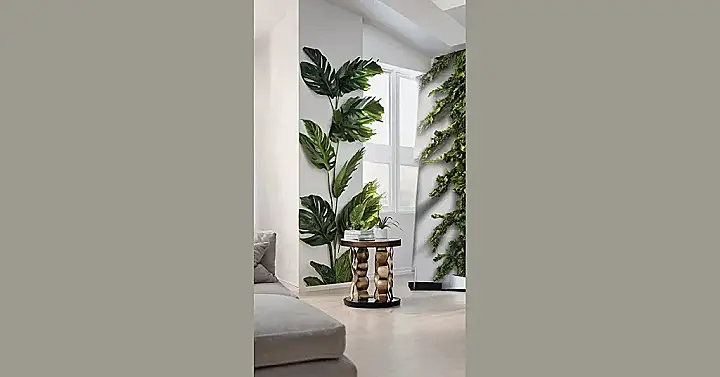 This living room is straight out of a jungle movie, but way more stylish. The wallpaper looks like a giant plant decided to climb the walls and call this place home. I bet the homeowners have to trim it every once in a while, or maybe they just let it grow wild, turning their living room into a full-blown rainforest!