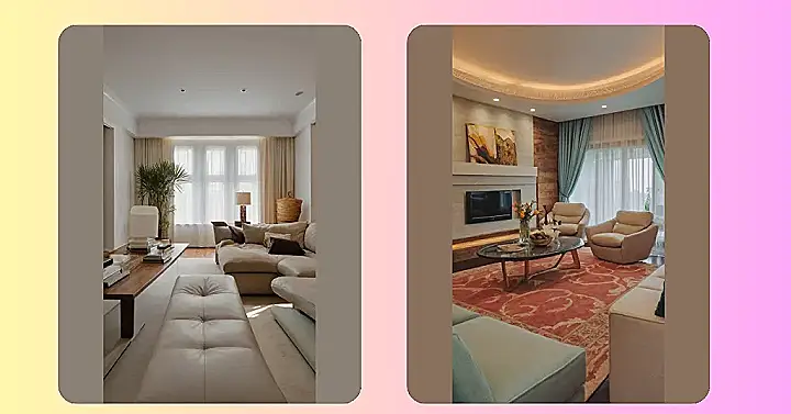 This living room is like a giant, comfy marshmallow you just want to sink into! With those plush couches and soft, inviting cushions, you could easily spend hours relaxing and watching your favorite movies. Even the lighting is perfect – not too bright, not too dim, just the right amount to make the room feel cozy and peaceful.