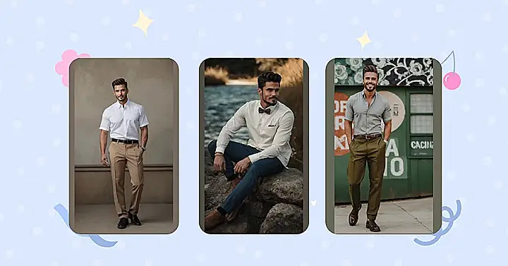 Looking at this fella, you might feel like you’ve just seen your dad’s weekend look, but way sharper! That white short-sleeved shirt and khaki pants combo is pretty much the ultimate secret handshake of Americana men’s fashion. It’s like the style equivalent of a classic pickup truck – simple, reliable, and surprisingly cool when done right. You don’t need flashy logos or wild colors; this look says, “Yeah, I know what I’m doing,” maybe even if you’re just trying to figure out what’s for dinner.