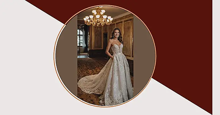 This absolutely stunning wedding gown looks like it floated straight out of a fairy tale! With its gorgeous lace patterns, elegant sweetheart neckline, and a train that gracefully sweeps the grand floor, this dress is pure magic. The bride herself is beaming, clearly having the best day ever under that fancy chandelier. But here’s the best part, and honestly, it’s a game-changer for all future brides: this beautiful dress has *pockets*! No more awkwardly holding your phone or trying to find a secret spot for your emergency lip balm; this gown is both gorgeous and totally practical.