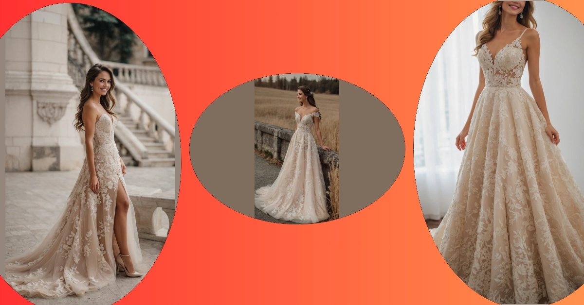 Forget everything you thought you knew about wedding dresses, because this one isn’t just a dress, it’s a whole vibe! With its stunning, soft goldish color, it practically glows, making everyone wonder if you secretly raided a leprechaun’s treasure chest. The way that lace just spills down in flowery patterns makes it look incredibly delicate and fancy, like something out of a fairy tale but way cooler. You’d probably need a team of tiny squirrels just to fluff that skirt before you walk down the aisle.