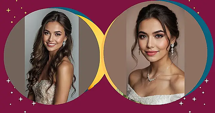 She’s got that “just married” glow, partly because of her stunning romantic wedding hair, but mostly because of that mega-watt smile! You can almost hear her thinking, “Nailed it!” as she gets ready for her big day. It’s like her hair and her smile are having a little competition to see who can sparkle more, and honestly, it’s a tie. Plus, that gorgeous lace dress and sparkling earrings complete the look so perfectly, it’s hard to imagine her stressing out about anything other than how many slices of cake she can sneak later. She’s the definition of bridal bliss, from her perfect part to her happy heart!