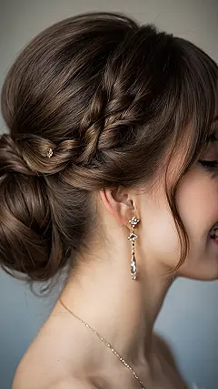 Plus, who needs a crown when your hair is already this regal? This hairstyle isn’t just about keeping your locks out of your face; it’s practically an art installation! Notice the cute little sparkly hair pin tucked in there, adding just a tiny touch of bling, along with those totally gorgeous earrings that practically dance with every movement. This classic updo is all about looking picture-perfect and feeling super confident on the big day, proving that sometimes, the best way to tackle a special event is to just twist it up, add some sparkle, and let your hair do all the talking (in the most elegant way, of course!).