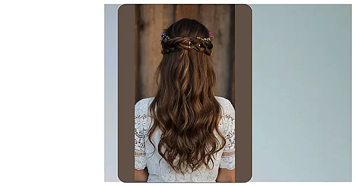 This hairstyle is seriously cool! It’s like a modern take on a classic hippie look. See that gorgeous braid wrapped around the top? It’s not your grandma’s braid – it’s super stylish and totally updated. The long, wavy hair flowing down is perfect for dancing the night away (or just chilling with friends). Plus, those sparkly little hair clips? They add a touch of magic, kind of like finding a four-leaf clover in your hair. It’s totally Instagram-worthy, and you could definitely rock this at a festival or a party – or even just a regular school day if you feel bold!