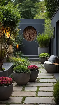 Forget about just throwing a few potted plants around; this place has serious style! Notice those awesome big pots holding everything from tall spiky plants to those cute pink blooms? They’re like the VIP seats for the plants. And that round, comfy-looking chair just begs you to curl up with a book, maybe even pretend you’re on a fancy vacation. The cool wall art and the stepping stone path add a touch of ‘wow’ that turns a simple area into a mini-resort. It’s all about smart design choices that make a small space feel expansive and super inviting, proving that even a compact patch can be your ultimate escape.