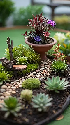 This isn’t your grandma’s garden—unless your grandma is a super-cool, miniature-obsessed wizard! Look at this teeny-tiny landscape: it’s like a whole world crammed into a container. There are itty-bitty succulents, a miniature wooden bench perfect for tiny fairies, and even a cute little pot with some seriously vibrant purple flowers. It’s miniature garden design at its finest, proving that big things come in small packages (especially if those packages are bursting with adorable plants!).
