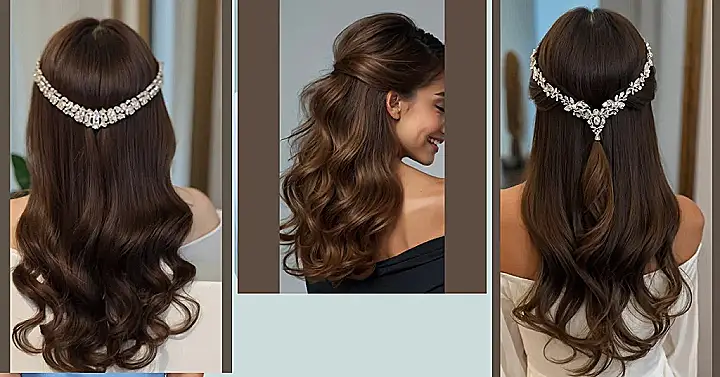Hey there, future prom queens and stylish superstars! Check out this gorgeous hairstyle – long, luscious locks with a dazzling jeweled headband. It’s like something straight out of a fairytale, but way easier to achieve than taming a unicorn! Imagine yourself rocking this look at a special event – you’d totally steal the show. It’s elegant, it’s sophisticated, and it’s got enough sparkle to rival a disco ball. Seriously, who needs a tiara when you have *this*?