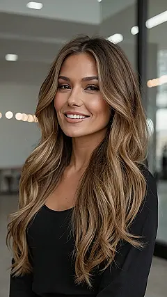 But here’s the funny part: This isn’t just any old brown-blonde combo. It’s called “balayage,” which is basically a fancy word for “painting” highlights onto your hair. So, instead of looking super-duper streaky, it’s all soft and flowy, kind of like a waterfall of color. It’s the kind of hair you could stare at for hours and still want to keep looking!