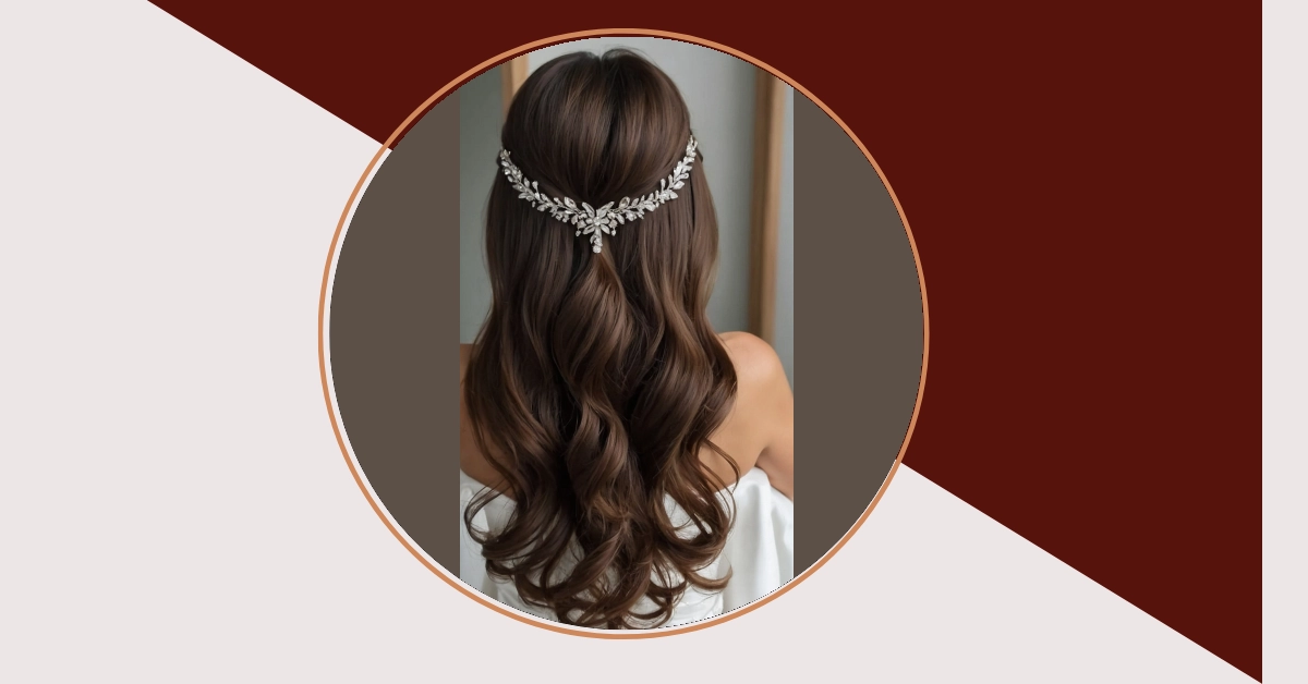 This hairstyle is like a fairytale come to life! Imagine being a princess (even if just for a day!) with gorgeous, flowing curls that cascade down your back. Half of your hair is pulled up elegantly, showing off a sparkly hairpiece that’s seriously dazzling – it’s like a mini constellation of bling! It’s the perfect mix of fancy and fun, a total win-win for any bride-to-be (or anyone who dreams of looking like one!).