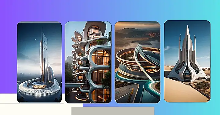 Imagine a world where buildings are like giant spaceships, all sleek and curvy with windows that shine like diamonds. This picture is like a peek into that future, and it’s super cool! The buildings look like they’re from a sci-fi movie, with their smooth lines and funky shapes. They’re so futuristic, it’s almost like they’re ready to blast off into space.