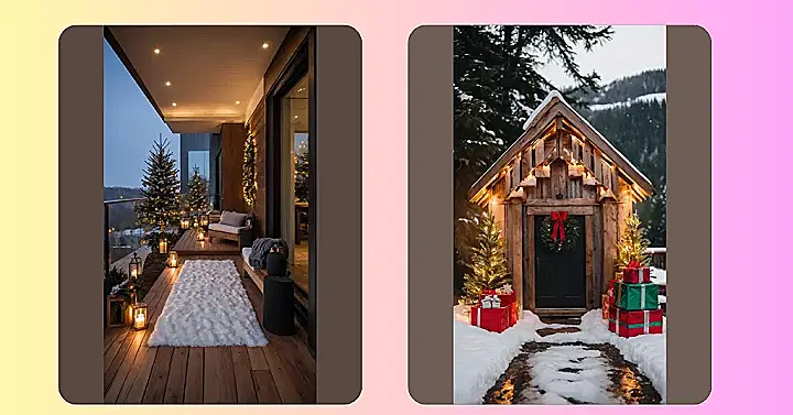 Look at this place! It’s like Christmas decided to throw a fancy party on a balcony, and we’re all invited. Those brave little Christmas trees outside are clearly winning at life, twinkling away with their golden ornaments, probably wondering if Santa will visit *their* branches first. With all those warm, glowing lanterns and that ridiculously fluffy rug, you could practically live out here, just bundled up in a blanket, sipping hot cocoa, and pretending you’re the star of your own holiday commercial. It’s the perfect ‘Christmas outdoor’ spot to get some fresh air without actually having to shovel snow, which is a major win in anyone’s book!