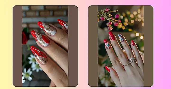 Seriously, these nails are the perfect blend of “I put in effort” and “I didn’t spend all day at the salon.” The red is super classic, and those little floral designs add just the right amount of “wow” factor without being too overwhelming. Plus, they’re the perfect excuse to show off your sparkly rings! Who needs mistletoe when you have this much festive nail-spiration?