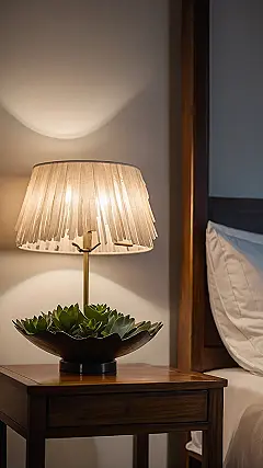 Check out this lampshade, it’s basically wearing a fancy outfit! Gone are the days of boring, plain shades; this one came to party with its cool fringed design. It’s like it whispered, “I’m not just here to cover a bulb, I’m here to *be* the vibe.” And honestly, with that warm, cozy glow bouncing off the wall, it’s doing a stellar job. You can tell it’s totally vibing with its little succulent buddies down below, creating a mini-oasis right next to your bed. Who knew a lampshade could have such style?