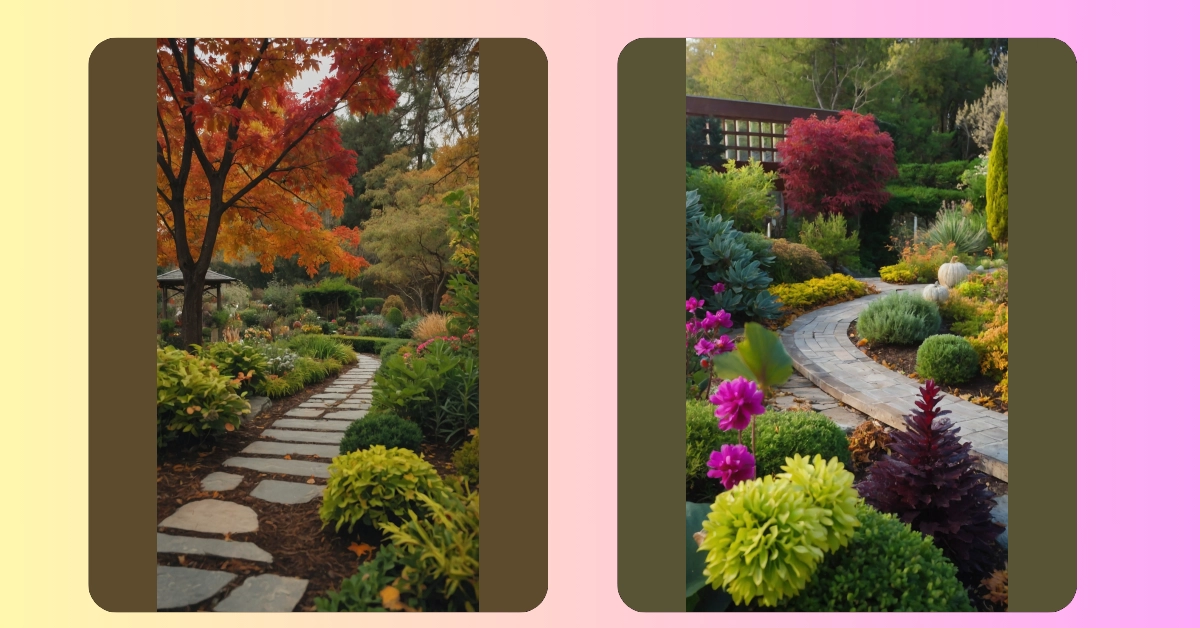 This picture is like a sneak peek into a magical autumn garden! It’s full of vibrant colors – like a mix of red, yellow, and green paint splattered on the leaves. You can almost feel the crisp autumn air as you walk on the stone path, surrounded by the changing foliage.