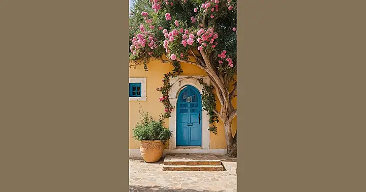 Forget boring beige, this house got the memo about living life in full color! With a wall that’s brighter than a lemonade stand on a sunny day and a door so blue it practically sings the blues away, this place is basically a giant, cheerful emoji brought to life. And those pink flowers? They’re not just pretty; they look like the house’s personal cheerleading squad, high-fiving the entire building and probably whispering secrets to the cool blue door all day long. Who wouldn’t want to hang out here?